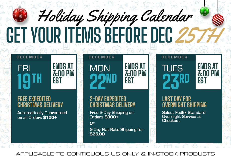 *Shipping guarantees apply only to items that are in stock and have shipped from our warehouse facility. We cannot guarantee your order arrives before December 25 if an item is backordered. In the event of a delayed package, MaxTow and the shipping carrier cannot be held liable. Please know that we will do everything we can within reason to ensure that your order is shipped and delivered in a timely manner. Expedited shipping options are available upon checkout.